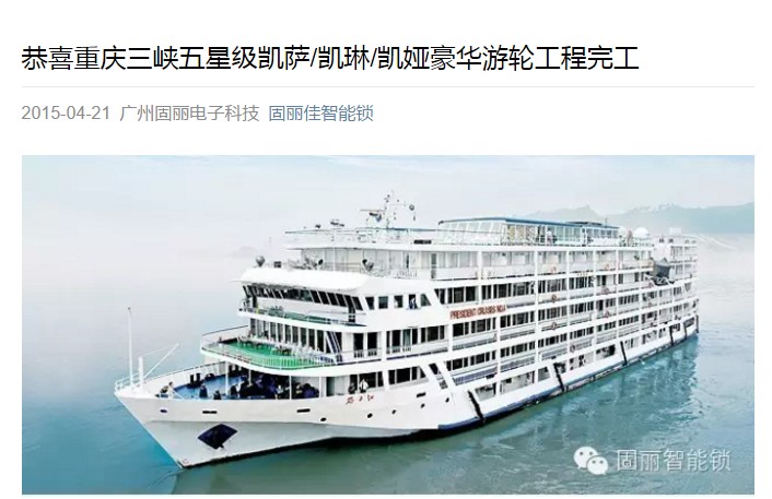 作為 長(zhǎng)江三峽豪華游船 中的佼佼者--凱蒂號(hào)游船,再次選擇與我們固麗佳合作,既是對(duì)固麗公司的信任,同時(shí)也是對(duì)固麗佳品牌及產(chǎn)品酒店門鎖的信任。